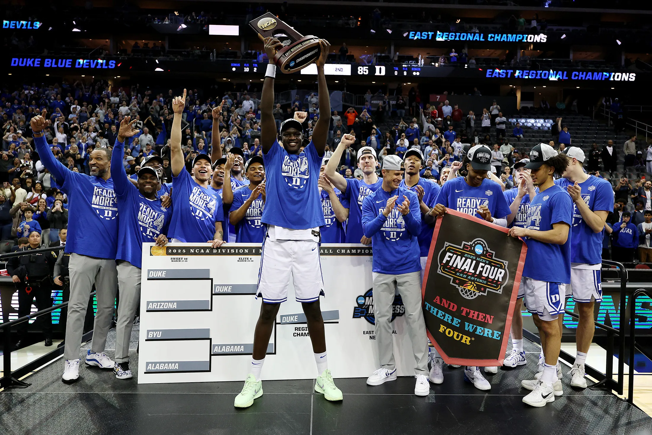 3月29日,杜克大學藍魔隊在新澤西州紐瓦克保誠中心慶祝擊敗阿拉巴馬大學紅潮隊,晉級NCAA男子籃球錦標賽東區精英八強。