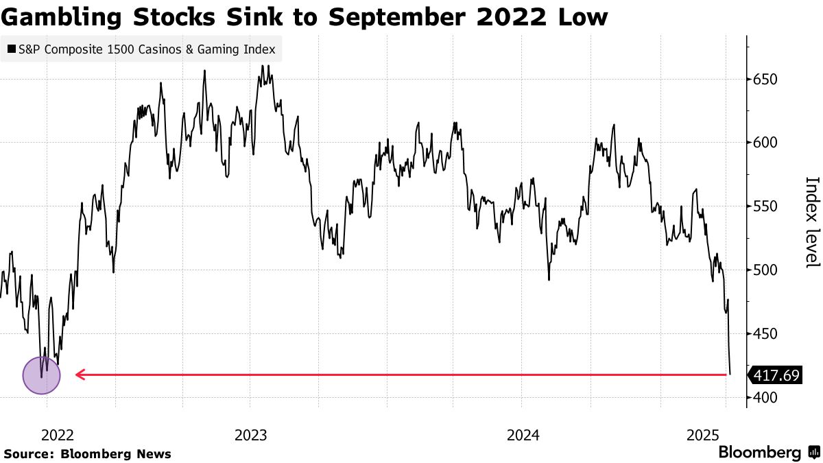 實體賭場正從其他方面感受到壓力。拉斯維加斯大道博彩收入2月份同比下降14%,客流量也隨之減少。因此,包含美高梅國際酒店集團和凱撒娛樂公司等最大成分股的標普綜合1500賭場與博彩指數已跌至2022年9月以來的最低水平。