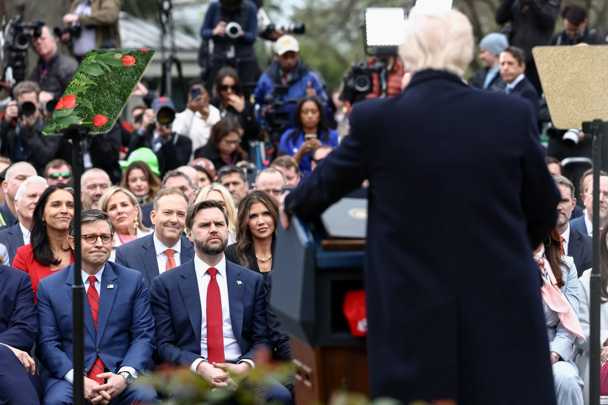 在白宮玫瑰園的關税政策活動現場,巨幅美國國旗構成的背景板前,頭戴安全帽的工人們列席觀眾區,特朗普直接訴諸他們的委屈情緒。