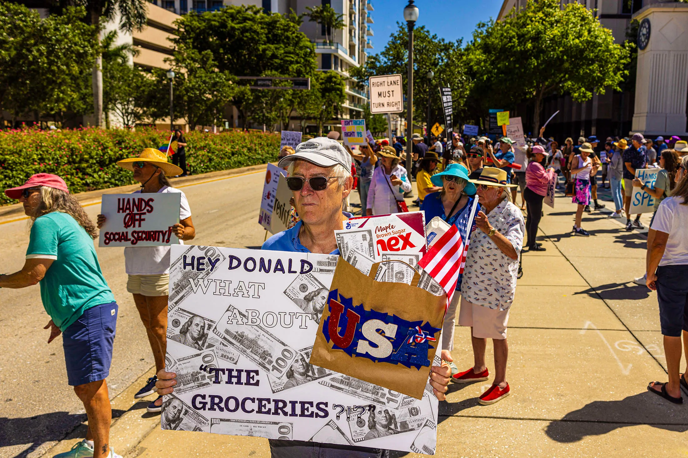 來自巴爾的摩的電影剪輯師特里·哈勒在棕櫚灘縣朱庇特農場鎮有房產,他參與了此次抗議。哈勒表示,由於市場對特朗普關税計劃的反應,他的個人財富遭受了損失。