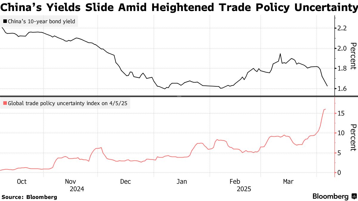 中國國債價格飆升,推動基準收益率逼近歷史最低點,因投資者出於對美國關税和貨幣寬鬆預期的擔憂而湧入避險資產。