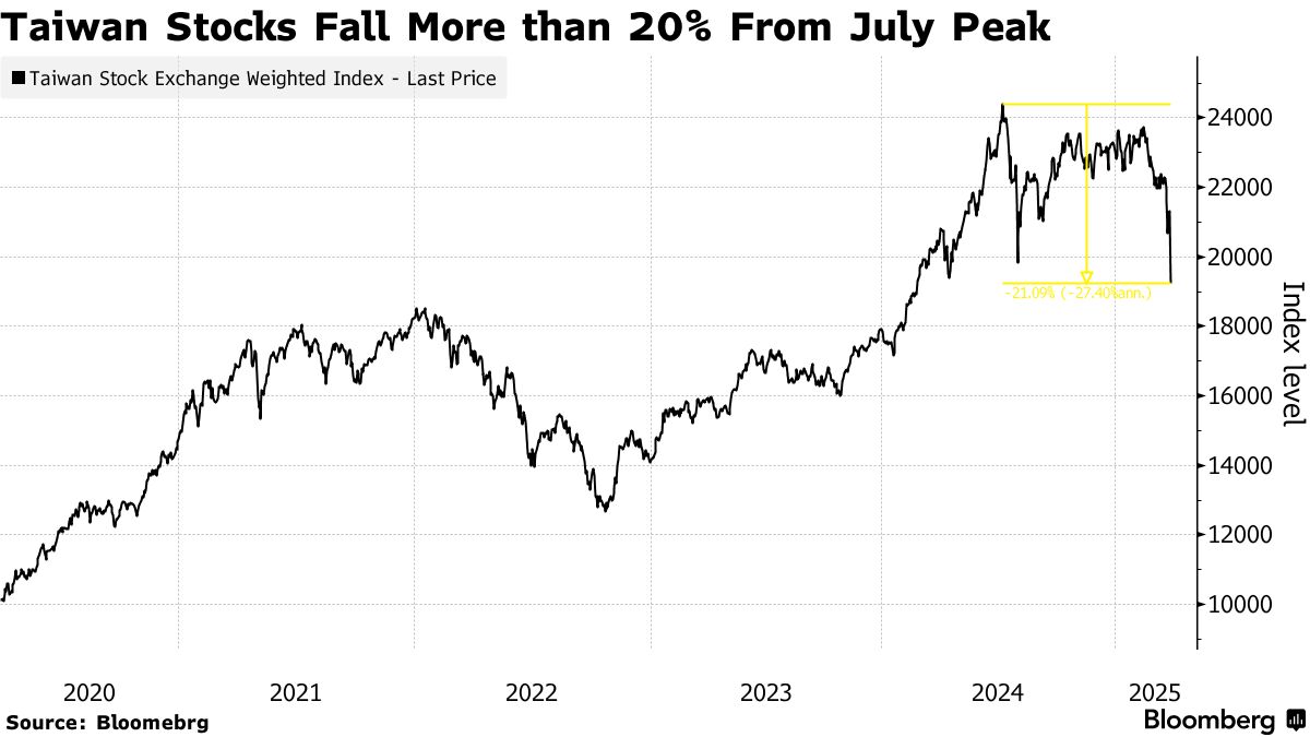 台灣股市指數創下有史以來最大跌幅,在假期後恢復交易時,因唐納德·特朗普總統提高關税引發的全球拋售而補跌,正走向熊市。