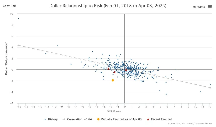 為了説明週四的異常,Exante Research的這張圖表展示了過去七年美元表現與標普500指數走勢的對比。黃色標記的是週四——這是一個非常顯著的異常值。如果這是因為對美國及其資產的信心真的動搖了,那將是一件大事: