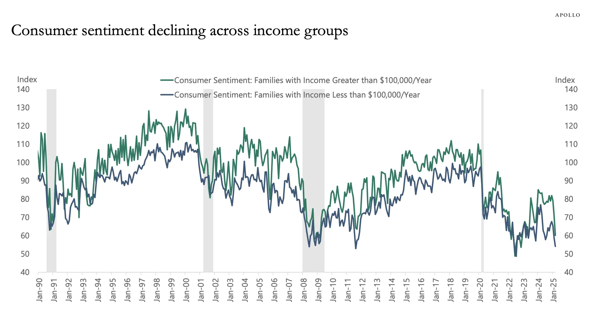 早在特朗普發動關税海嘯之前,美國消費者信心就已急劇下滑,且未見轉機。阿波羅全球管理的這張圖表清晰展現了消費者情緒的全面惡化: