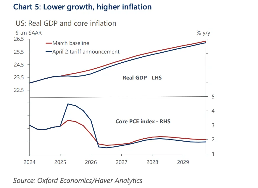 鮑威爾稱強勁的商品通脹數據"極其意外",因此核心商品——本應承受關税衝擊的領域——可能成為關鍵觀察指標。牛津經濟研究院的伯納德·亞羅斯和格蕾絲·茲韋默預測,在經濟增長放緩至約1.3%(低於此前2%的預期)的背景下,年底核心商品通脹可能飆升至4.5%: