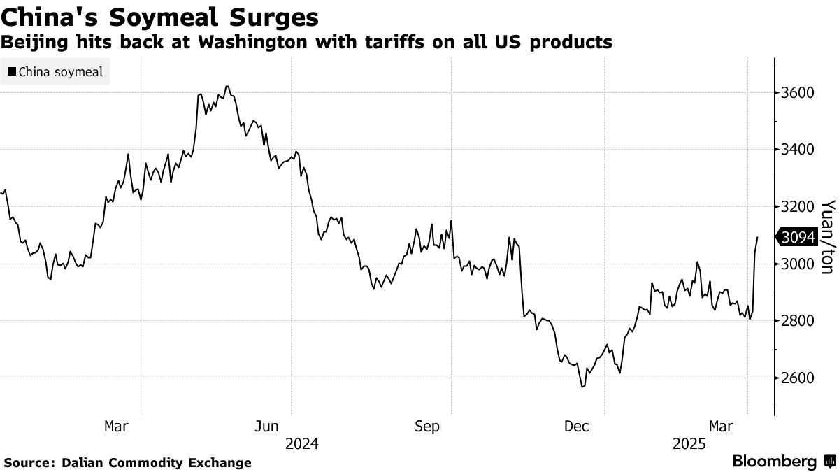 北京方面上週五反擊華盛頓的關税措施,宣佈自4月10日起對所有美國進口商品加徵34%關税。這項重税涵蓋大豆,或將導致中國從其第二大供應國進口的油籽停運,攪亂2024年價值逾120億美元的貿易。