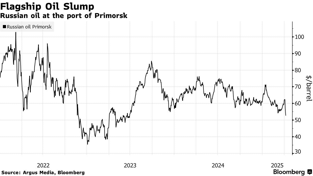 阿格斯傳媒數據顯示,上週五該國主要出口油種烏拉爾原油在波羅的海普里莫爾斯克港價格跌至每桶52.76美元,這是自2023年6月以來首次跌破50美元關口。