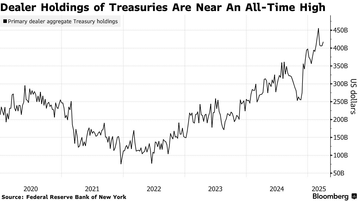 近年來為填補財政赤字並置換美聯儲縮表(QT)到期的證券,國債發行量激增。這導致一級交易商需消化更多供給,而接近歷史峯值的持倉量正制約其中介職能。