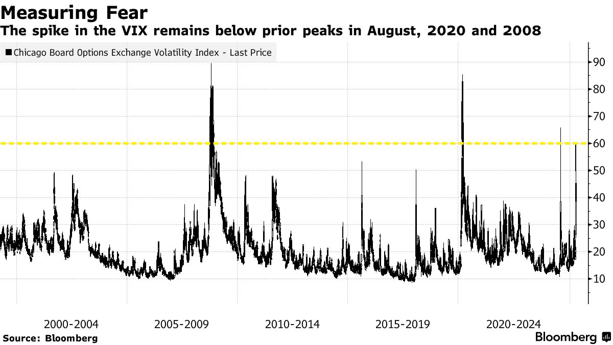 該指數衡量投資者對股票波動保護的需求,在8月由日元套利交易平倉引發的市場暴跌期間達到近66的峯值,而在2020年由新冠疫情引發的拋售中達到85。2008年,由於對金融危機的擔憂重創股市,該指數飆升至接近90。