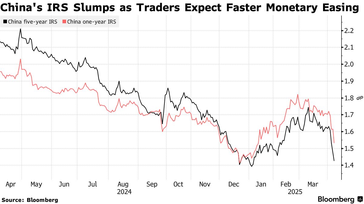 “中國五年期利率互換的急劇下跌表明,市場認為中國人民銀行可能會採取先發制人的行動,以緩衝美國關税可能帶來的經濟衝擊,”駐上海的三菱日聯銀行中國環球市場部首席金融市場分析師孫馬克表示。“這一轉變似乎是由於對最近宣佈的美國關税可能帶來的拖累日益擔憂所驅動,這被視為對中國經濟的外部衝擊。”