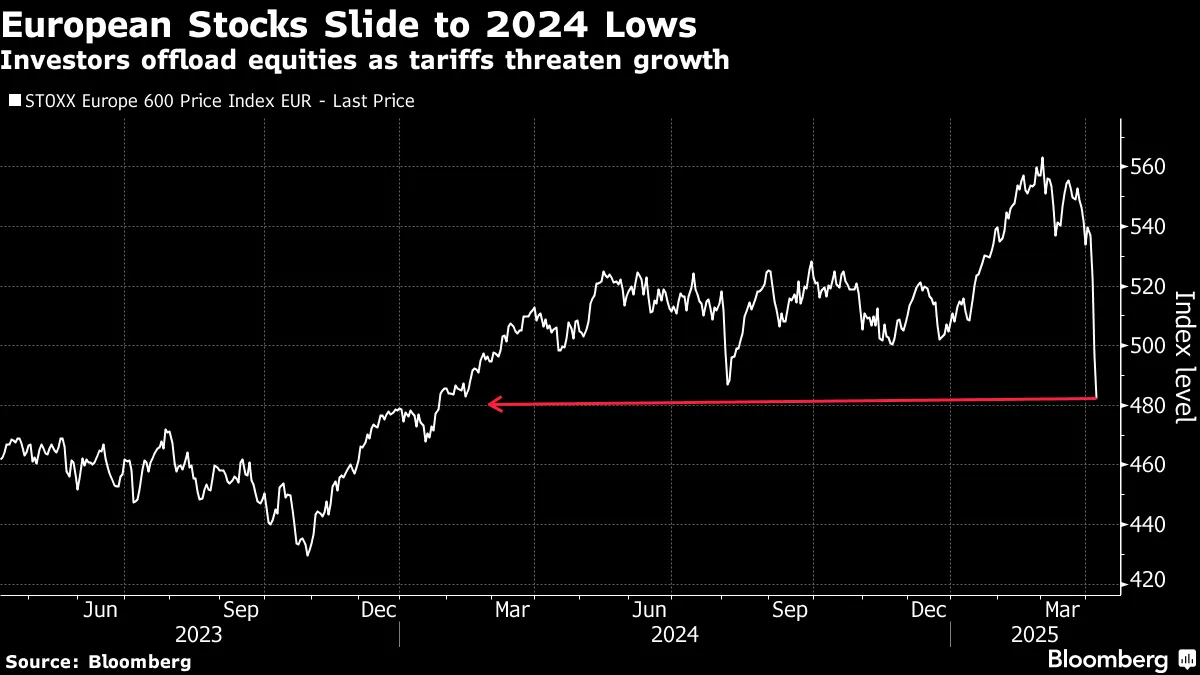 歐洲股市經歷了急劇逆轉。過去幾周因德國財政改革和歐洲國防投資談判帶來的樂觀情緒消退後,唐納德·特朗普的關税政策現已引發市場暴跌。歐洲股市昨日延續跌勢,拖累歐洲斯托克600指數跌至2024年1月以來最低水平。隨着國防板塊此前領漲股帶頭拋售,此次暴跌創下新冠疫情爆發以來最差單週表現。