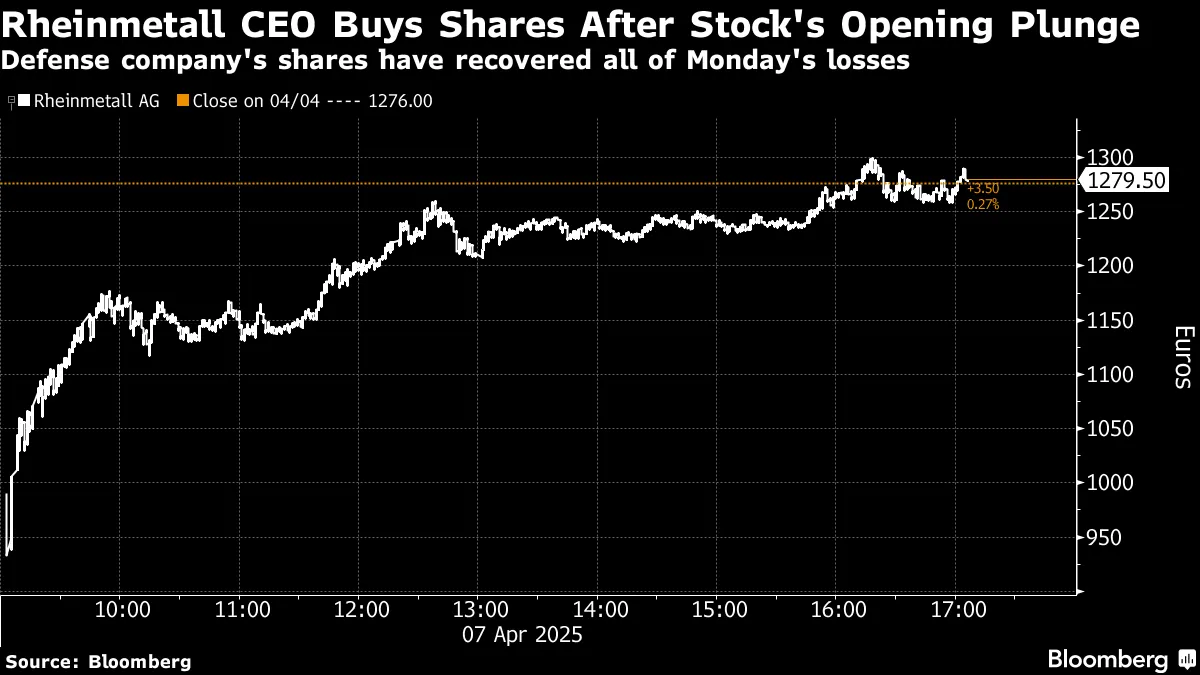 萊茵金屬股價暴跌促使這家德國防務集團首席執行官斥資逾71萬歐元(78.1萬美元)增持股份,目前他已實現盈利。該股昨日開盤下跌27%後,已收復全部失地。在特朗普引發風險資產加速拋售後,阿明·帕珀格的押注或許有助於安撫投資者情緒。