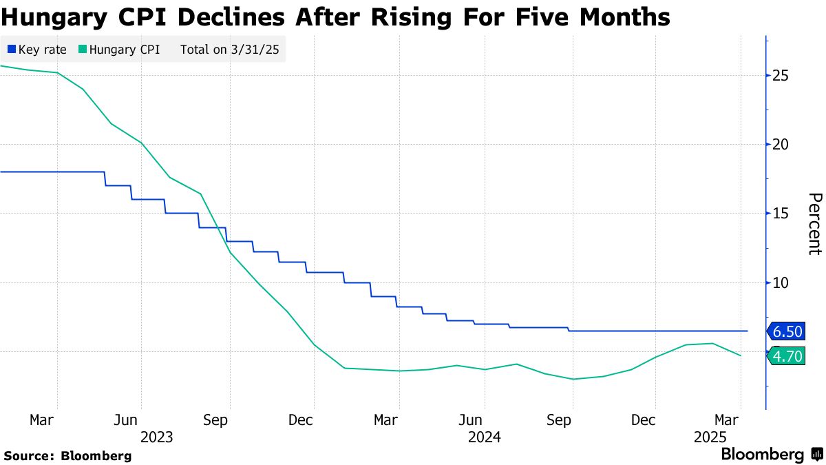 在全球關税動盪中,匈牙利全年通脹預期近期開始下調。上週,巴克萊、摩根士丹利和渣打銀行分析師對2025年全年的預測均低於市場共識。貨幣市場交易員因經濟衰退擔憂加大了對貨幣寬鬆的押注,目前預計今年年底將有兩次25個基點的降息。