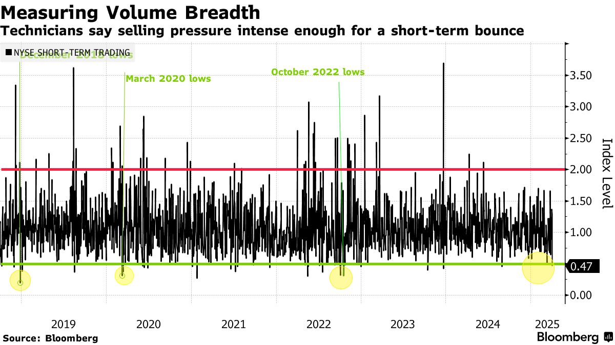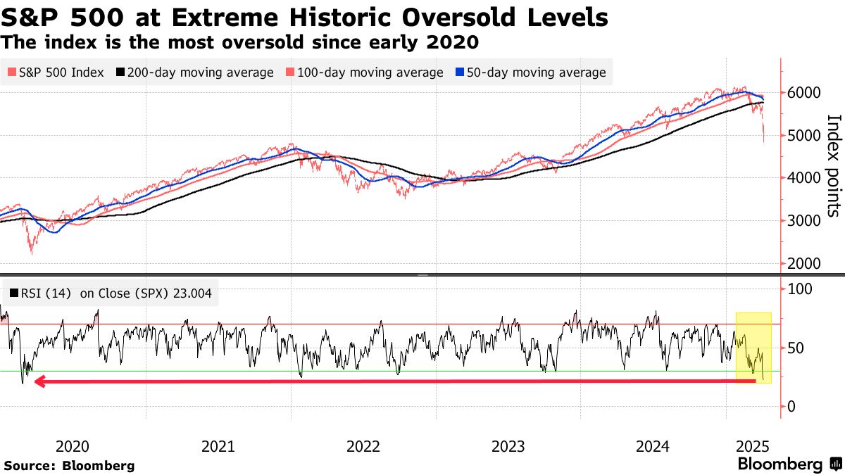 儘管週二股市似乎有望部分復甦,但標普500指數仍較2月19日的峯值下跌15%。週一,14日相對強弱指數跌至23——這是自2020年以來的最低水平,遠低於歷史上標普500指數即將反彈的水平。