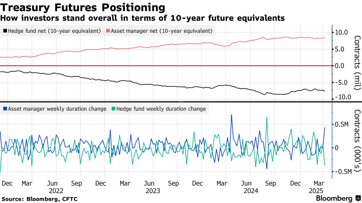 截至4月1日當週(特朗普公佈關税計劃前一天),資產管理機構和對沖基金的持倉均出現重大調整。總體而言,資產管理公司淨久期多頭增加約43.8萬份10年期國債期貨當量,而對沖基金的淨久期空頭頭寸擴大約37.5萬份10年期國債期貨當量。資產管理公司最大幅度的調倉體現在超長期國債期貨上,其淨頭寸風險敞口擴大至每基點1280萬美元;而對沖基金最大的淨空頭增持出現在中期合約中。