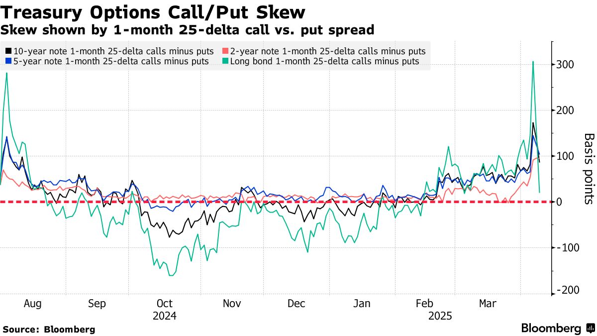 近期國債波動性亦體現在期權偏態上:上週末看漲期權溢價急劇走闊,而隨着本週收益率回升,偏態已回落至中性附近。期權市場週二出現押注行情,目標指向週三收盤時10年期收益率從當前4.28%升至約4.35%。
