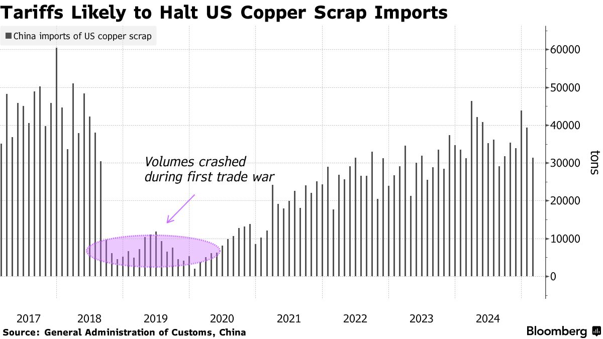 中國迅速採取對等措施,將華盛頓全面加徵的34%關税予以回擊,此舉可能導致從下月起美國廢銅運輸中斷。去年美國約佔中國海外採購量的五分之一,這些廢銅被用作短缺銅礦石的替代原料。