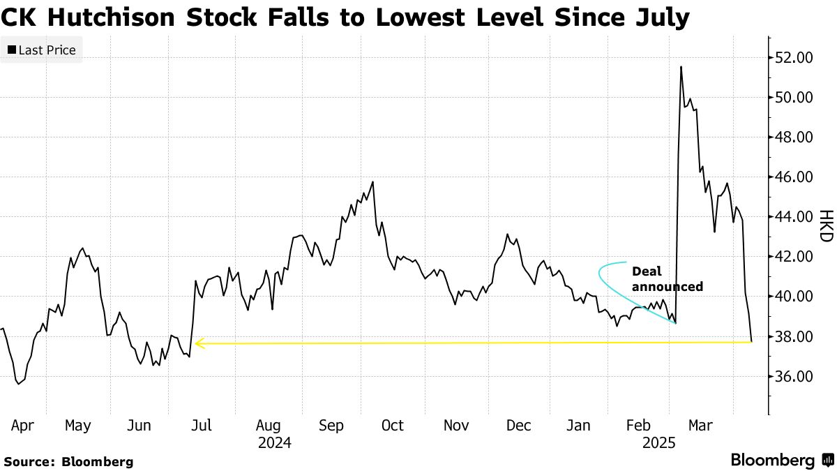 彭博行業研究分析師丹妮絲·黃表示,該公司股價下跌與整體股市走勢一致,“可能並不意味着市場認為其資產出售會失敗。”儘管如此,“由於商業風險加劇,尤其是貿易戰升級和巴拿馬可能撤銷與和記黃埔的合同,資產估值仍可能面臨大幅修正的風險。”