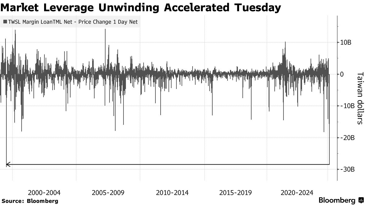 在本週股災中,交易員爭相解除槓桿頭寸。根據彭博彙編數據,週二平倉加速,融資餘額單日減少285億元新台幣(8.62億美元),創1999年7月以來最大降幅。