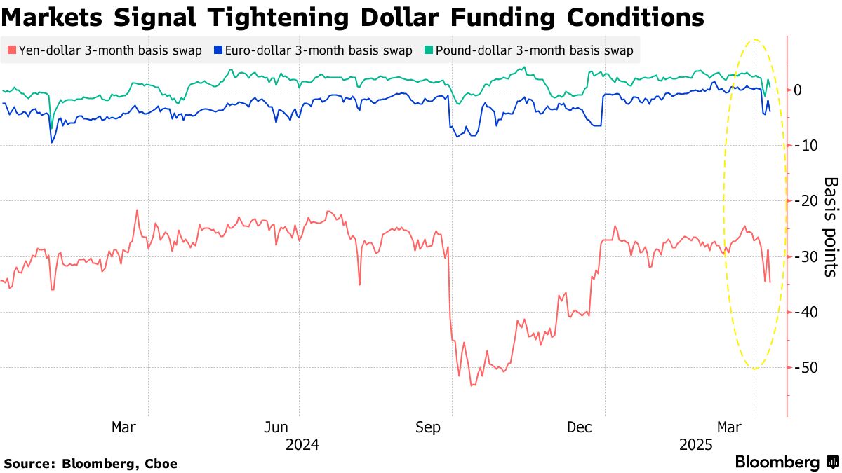 目前融資市場尚顯穩健。但三個月期日元-美元基差互換利差已擴大至去年12月以來最高水平,顯示海外投資者對美元融資需求激增。歐元和英鎊的等效基差互換也出現類似下跌。