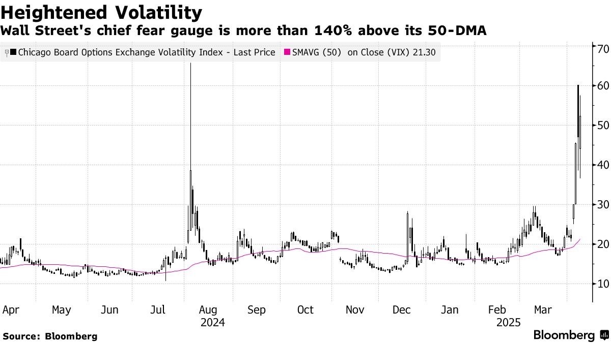 劇烈單日波動持續主導市場。週二,華爾街恐慌指數Cboe波動率指數(VIX)收於50上方,較50日均值高出逾140%。該指數週一曾飆升至60。
