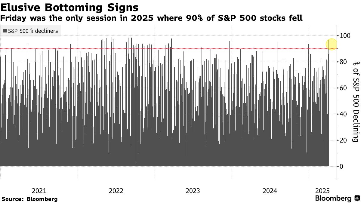 這通常會導致標普500指數中90%成分股連續多日下跌。今年迄今,這種情況僅在上週五出現過一次,交易員正等待更多信號來確認投資者正在集體拋售股票。