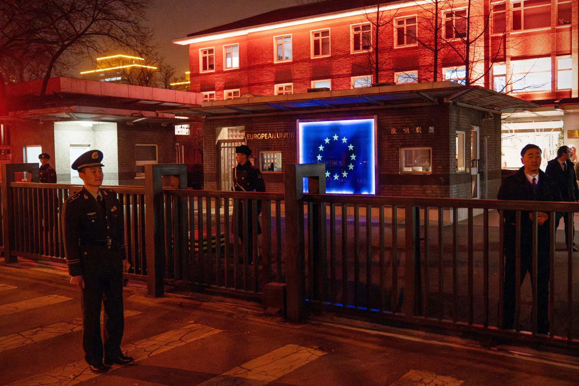 2023年12月歐盟官員在北京舉行新聞發佈會的場地。攝影師:安德烈亞·韋爾代利/彭博社### 全球必讀