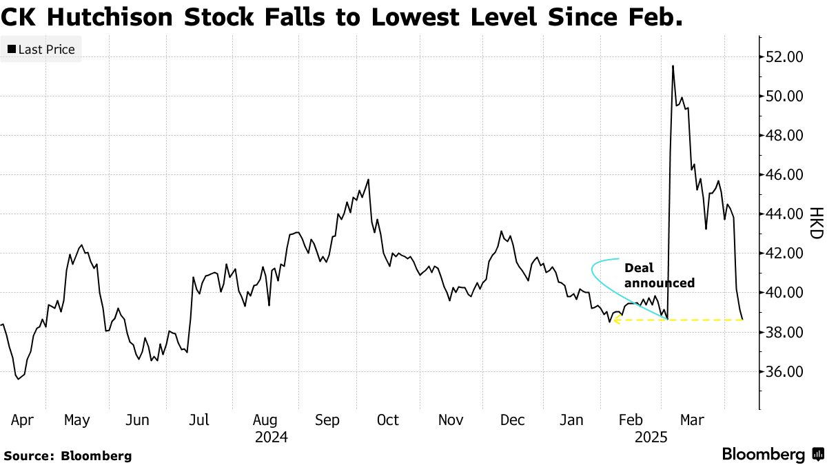 長和股價週三延續跌勢,抹去自上月同意將巴拿馬運河港口資產出售給貝萊德領銜財團以來的全部漲幅。