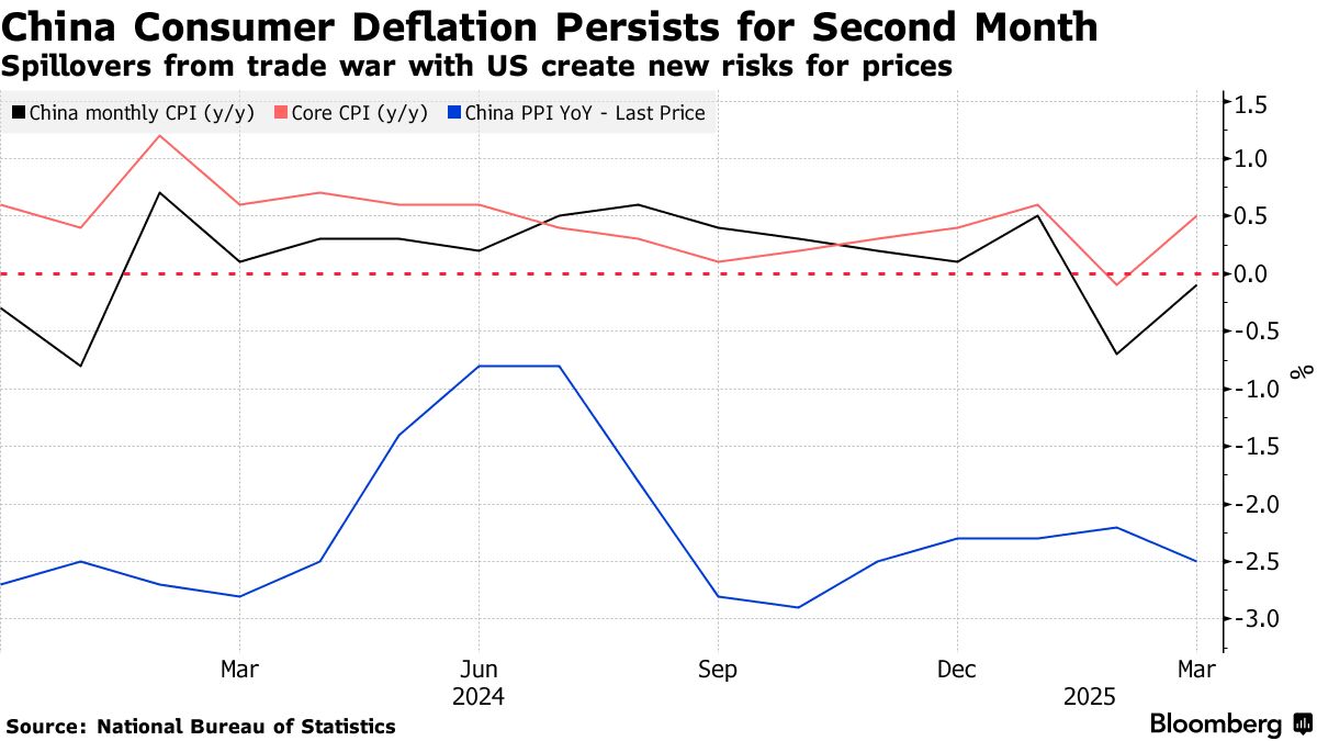 中國消費者價格通縮在3月持續第二個月,隨着中美貿易戰升級,可能對價格施加更多下行壓力。