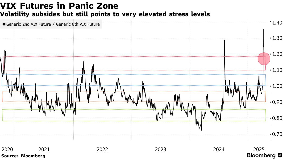 當然,全面貿易戰的最壞情況目前得以避免,但市場紊亂將持續存在。壓力並未從市場中消失,遠非如此。誠然,波動率正在快速緩解,但流動性如此之差,以至於像這樣的大幅上漲隨時可能發生,尤其是在受貿易頭條驅動的市場中。事實上,VIX曲線目前仍處於壓力區間。