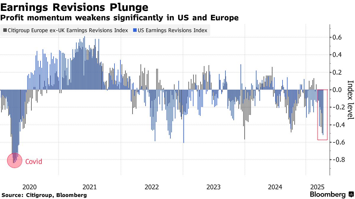 高盛經濟學家迅速撤回了經濟衰退預測,但對企業而言形勢尚未好轉。在週五一季度財報季拉開帷幕前,分析師已開始提前消化盈利受損預期。花旗集團編制的盈利預測調整指標顯示,大西洋兩岸的企業盈利預期均大幅下調,逼近五年區間低點——儘管尚未觸及衰退警戒線。