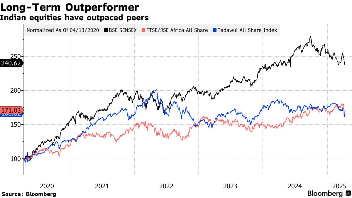 作為全球增長最快的主要經濟體,印度的債券和股票經受住了美國總統唐納德·特朗普提高關税的舉措。在這位美國領導人暫停加徵關税之前,這個亞洲國家的股票表現有望自2009年以來首次大幅超越地區同行。印度商務部長皮尤什·戈亞爾表示,這場貿易混亂為改革和從中獲利提供了“千載難逢的機會”。