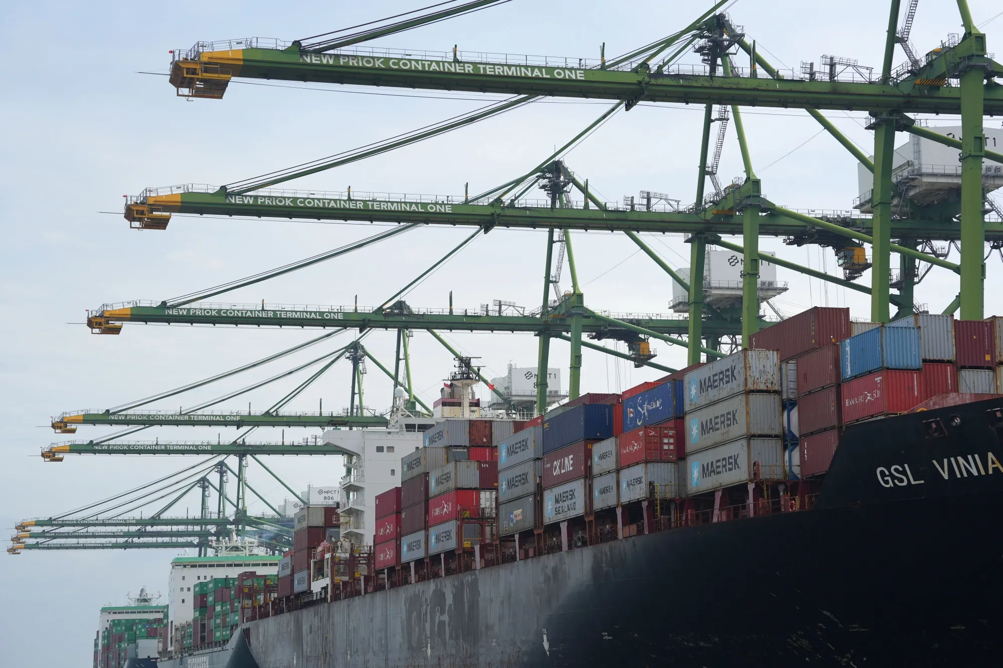 印度尼西亞集裝箱碼頭,一艘貨輪在龍門吊下停靠。