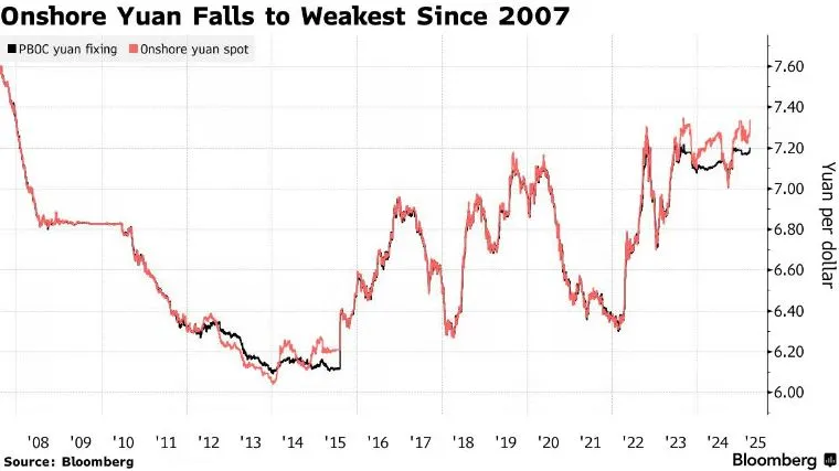 此外,這為特朗普政府將中國列為匯率操縱國提供了口實——美國在其首個任期內就曾這樣做。財政部長斯科特·貝森特本週敦促中國不要令人民幣貶值。