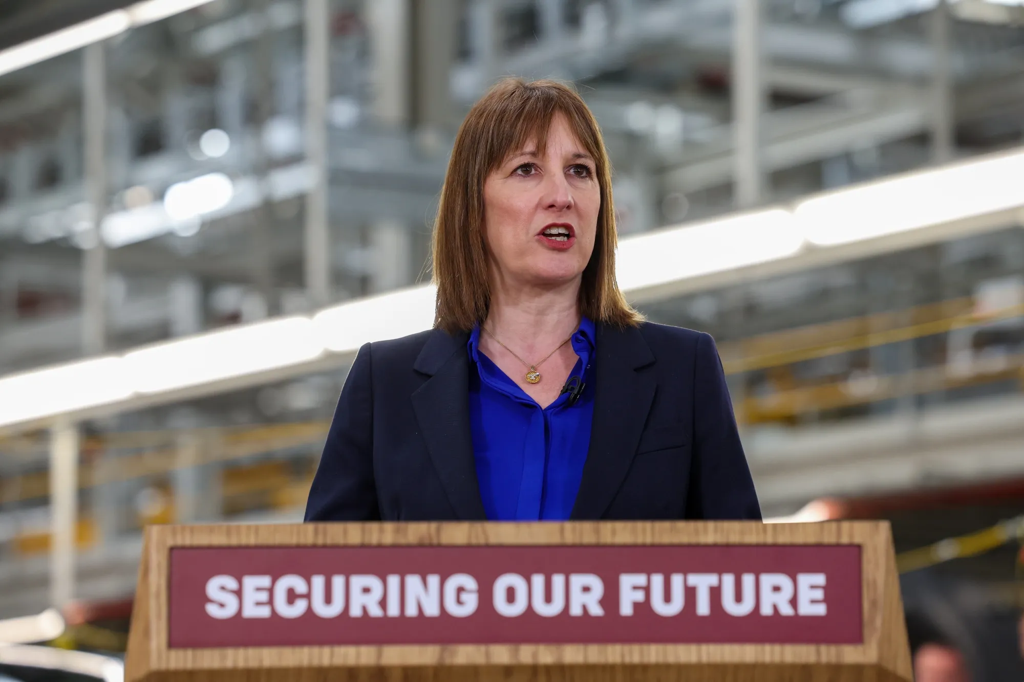 2025年4月7日週一,英國財政大臣瑞秋·裏夫斯在索利哈爾捷豹路虎汽車製造廠發表演講。