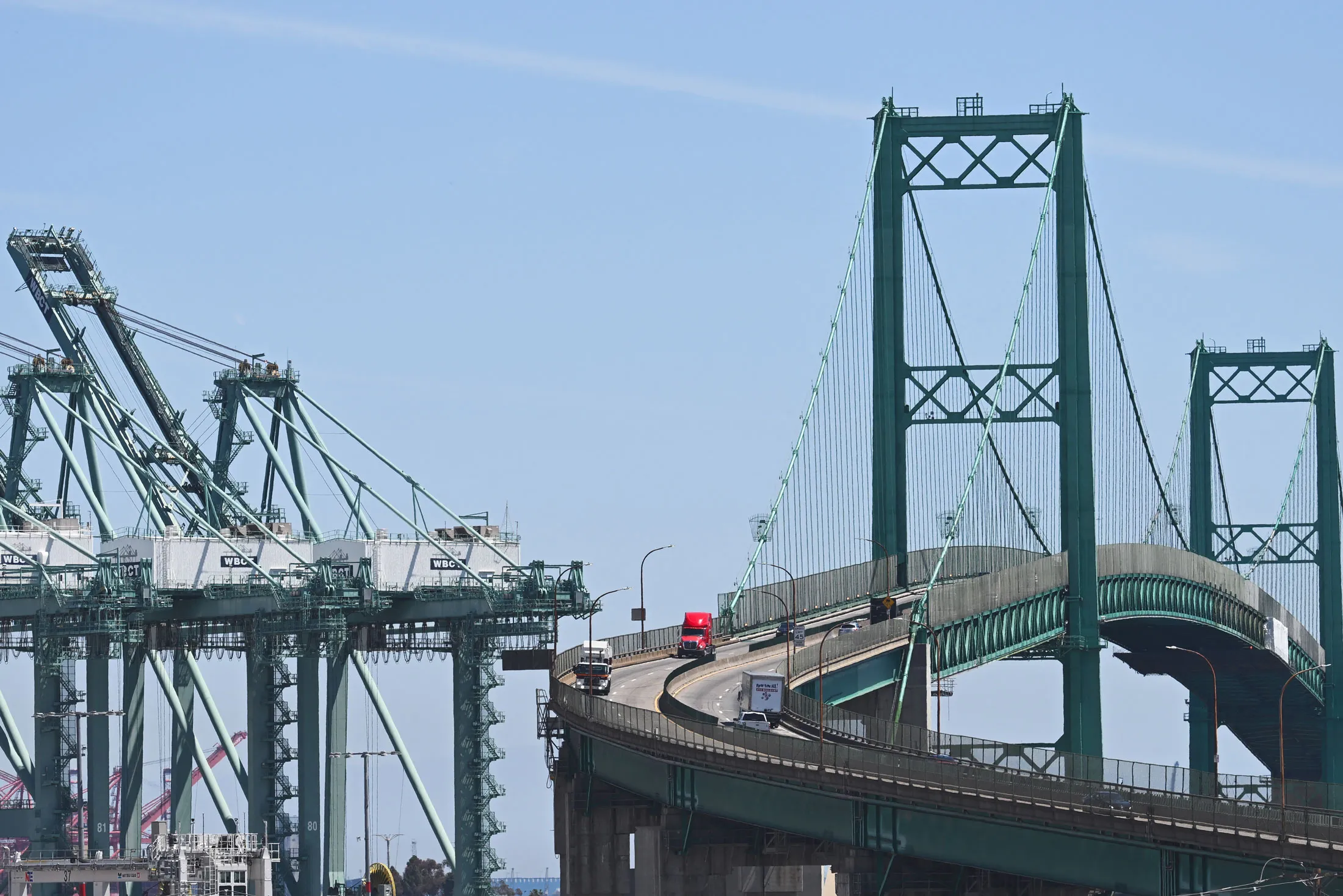 4月10日,卡車穿越洛杉磯港的文森特·托馬斯大橋。攝影師:Patrick T. Fallon/AFP/Getty Images