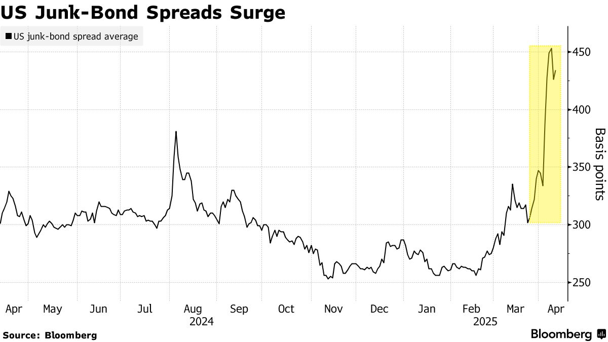 4月3日——即特朗普所謂"解放日"次日——投資者持有高風險債務而非國債所要求的額外收益率創下2020年以來最大漲幅。據彭博指數顯示,本週美國垃圾債收益率溢價突破450個基點。