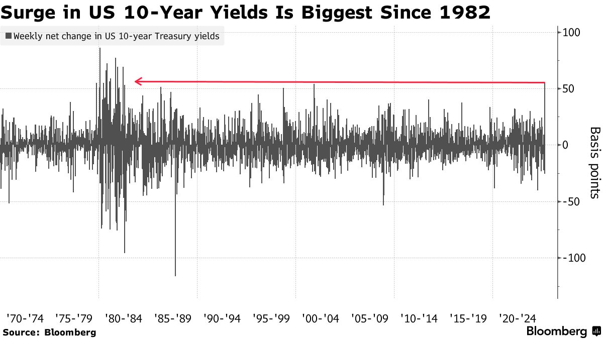 隨着投資者持續撤離美國資產,國債拋售潮加劇,推動長期收益率邁向自1980年代以來最大單週漲幅。