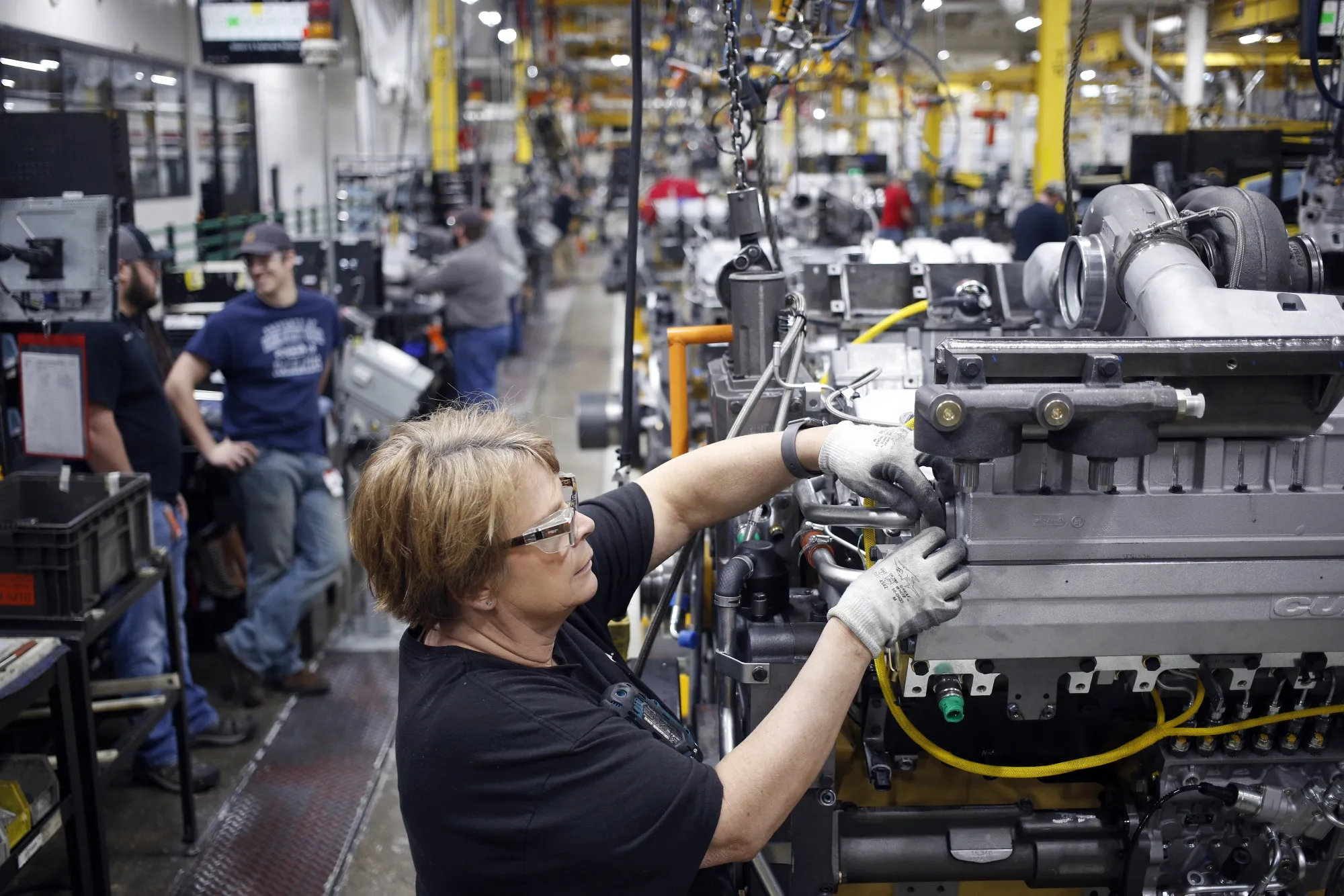 在印第安納州西摩市,一名工人正在組裝柴油發動機部件。