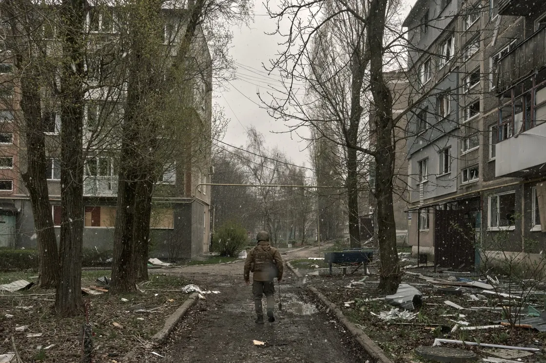 4月8日,一名士兵走過烏克蘭波克羅夫斯克被摧毀的居民樓。