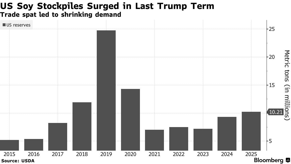 農民們對此並不陌生。特朗普在上個任期內發起的對華貿易戰曾導致美國大豆需求放緩,國內大豆庫存激增,短短四年間增長逾兩倍。