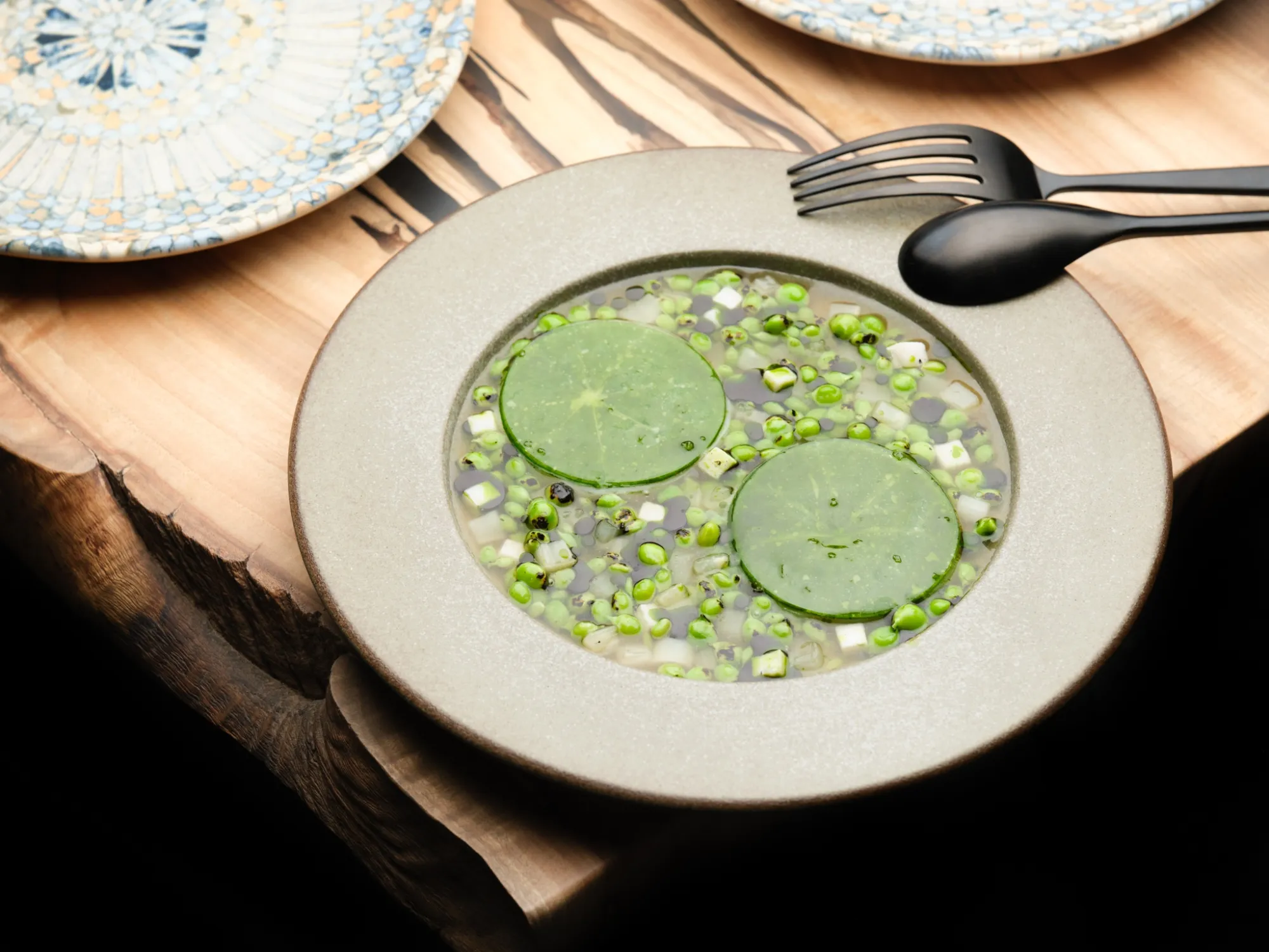 Roganic餐廳的北海道扇貝配烤奧斯卡豌豆、白蘆筍、旱金蓮及豌豆殼高湯。圖片來源:Roganic