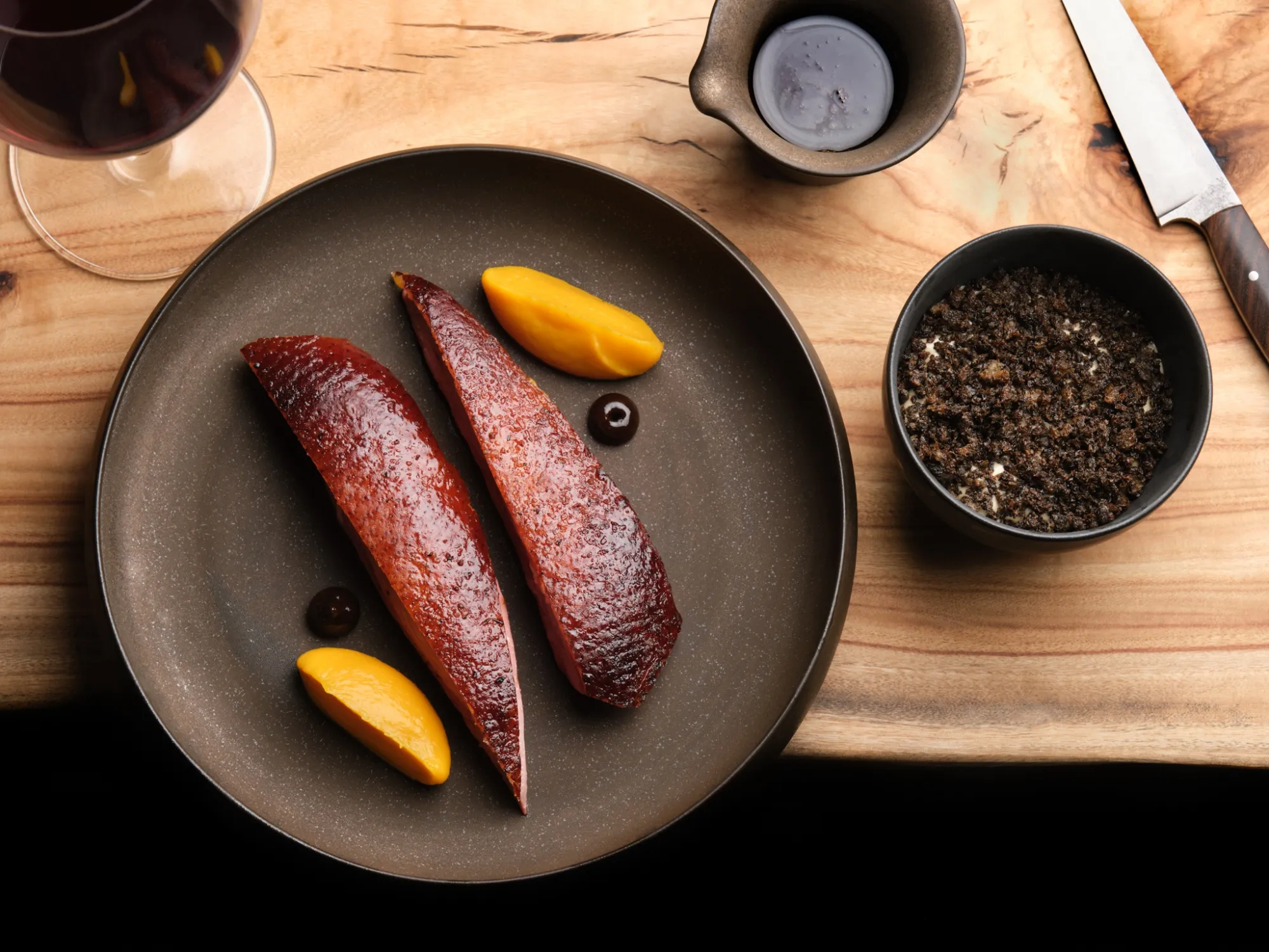 乾式熟成廣東鴨。來源:Roganic**菜品如何?**我吃得非常飽,當晚直接跳過了晚餐。最驚豔的是那道塗滿百花蜜、配醃核桃的乾式熟成廣東鴨——酥脆甜美的外皮下是汁水豐盈的鴨肉與恰到好處的脂肪層。海鱸魚和生蠔同樣令人愉悦,搭配梭子魚籽和發酵豆薯,竟迸發出芥末般的刺激感。但我的最愛是追加的北海道扇貝:搭配桃源蘆筍、旱金蓮和煙燻高湯,清爽感十足。