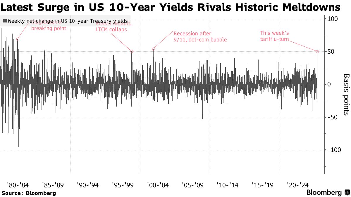 美債連續第五日下跌,因投資者撤離美國資產,推動長期收益率邁向1980年代以來最大單週漲幅之一。這場由撼動全球市場的貿易戰引發的拋售,可能通過更廣泛地推高借貸成本,對經濟造成又一次衝擊。
