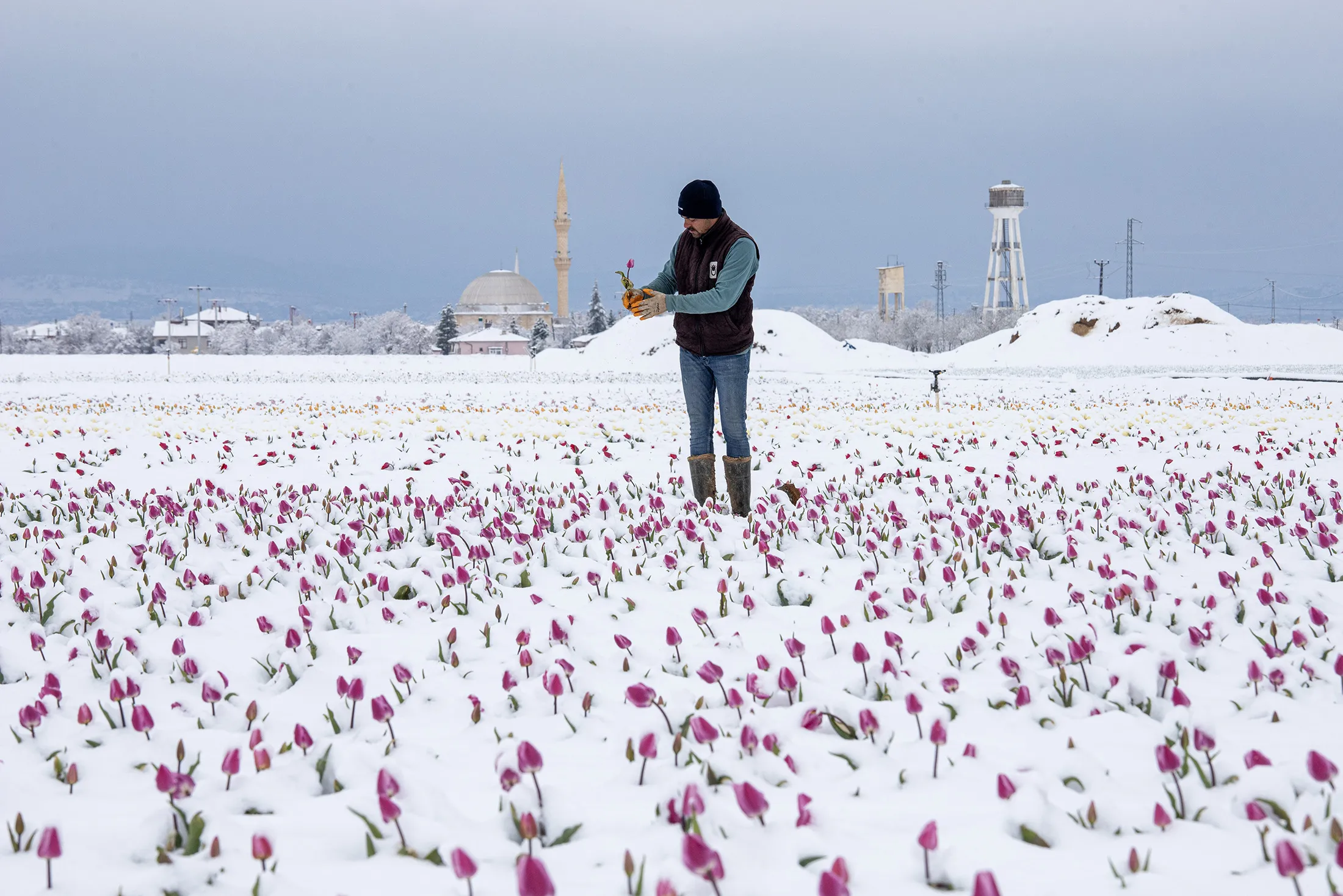 2025年4月10日,土耳其卡拉曼省卡齊姆卡拉貝基爾區,一名工人正在檢查春季被積雪覆蓋的鬱金香田。