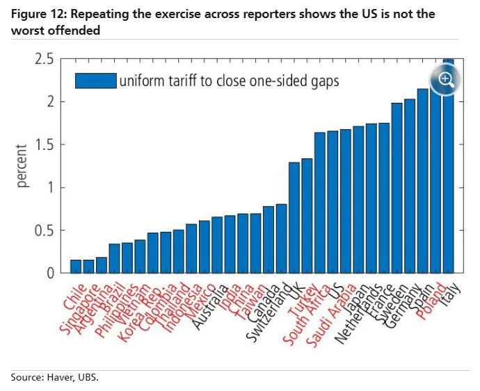 顯然,戰後任何貿易談判成果都被全盤否定。這種想法本身就很荒謬。再提供一個衡量角度:瑞銀集團經濟學家阿倫德·卡普坦團隊分析了完全對等關税(即各國對每類產品徵收與其貿易伙伴完全相同的關税,逐產品、逐國家精確對應)對整體關税水平的影響。圖表顯示了各國為實現與所有貿易伙伴的完全對等關税,需要提升的整體關税幅度。提升幅度越大,説明該國當前貿易條件越不利。