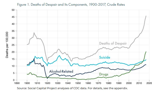 那麼這種觀點從何而來?問題不在於美國經濟蛋糕的規模或其全球佔比,而在於美國人之間的分配方式。全球化對美國製造業就業造成嚴重衝擊,加劇了不平等。這並非民粹主義的虛構敍事;十多年來,經濟學家、政界人士和普通民眾一直將其視為重大危機。最引人注目的是,安格斯·迪頓和安妮·凱斯提出"絕望性死亡“概念來診斷這一嚴峻社會危機: