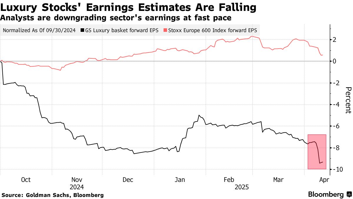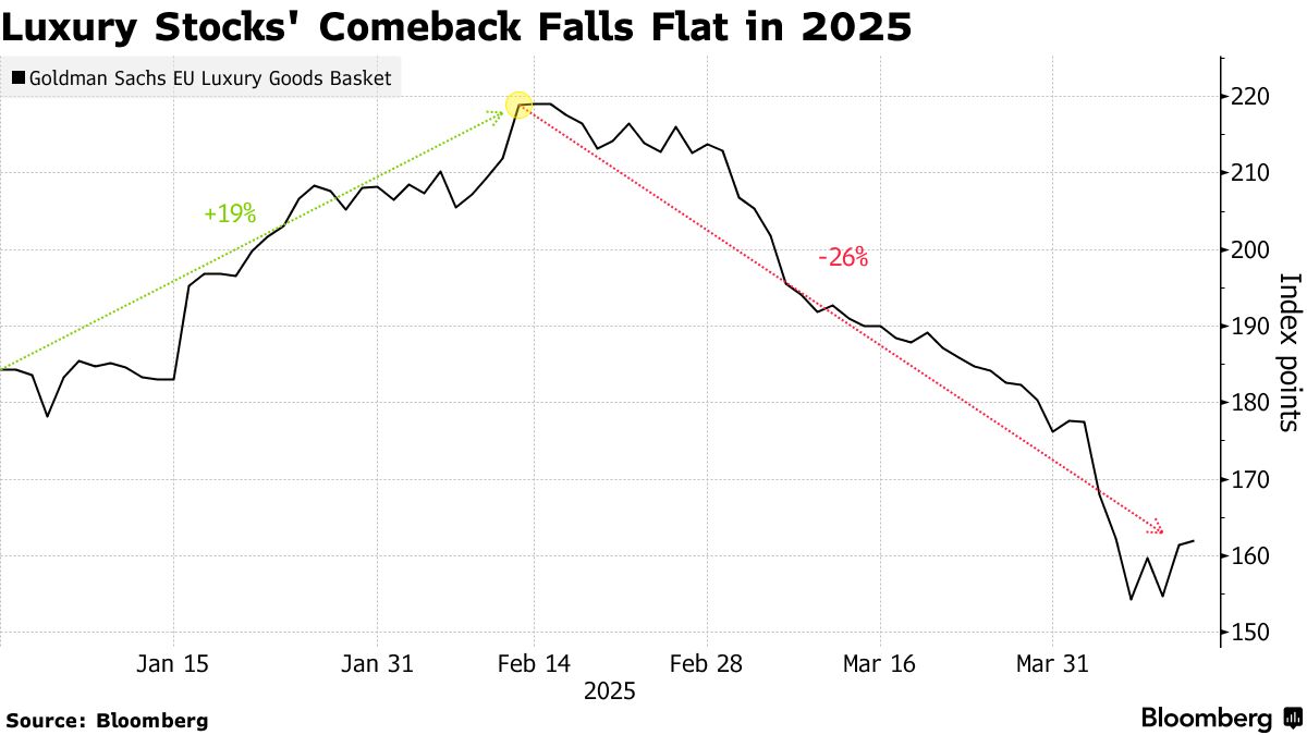 這些關税——包括對中國商品實際徵收145%的關税,以及對歐盟近期下調至10%的税率——已攪動風險資產,並導致歐洲股市進入調整期。高盛的奢侈品股票籃子今年下跌12%,正邁向2018年以來最糟糕的年度表現。而在2月峯值時,該籃子年初至今漲幅曾達20%。