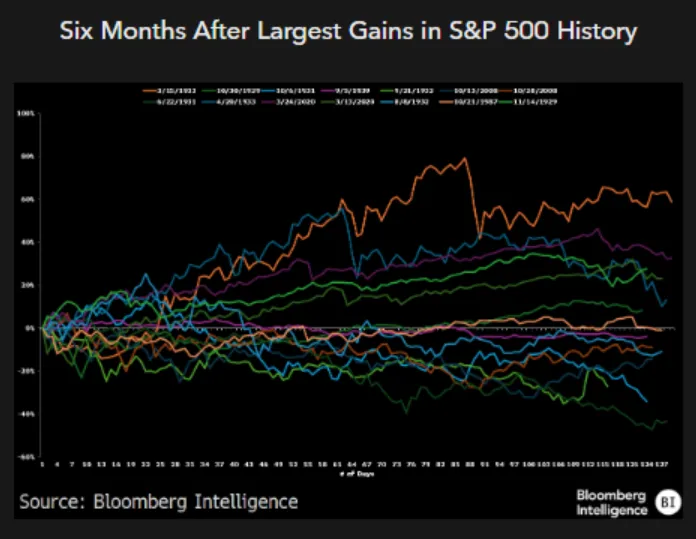 標普500指數歷史上表現最佳的日子通常預示着短期內回報將低於平均水平。彭博情報數據顯示,回溯至1928年,在該指數15個最大單日漲幅之後,六個月後上漲的概率僅為43%。這低於標普500指數在任何給定日期未來半年上漲的67%概率。