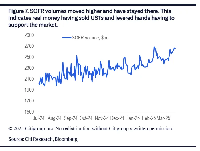 “**出現了一場完美的掉期利差多頭去槓桿風暴,這源於套利交易與去監管頭寸的雙重作用,疊加多類投資者的直接拋售。**查看龐大的TRACE國債成交量就能找到明確證據,但最關鍵的是SOFR成交量較3月最後一週增加了約2000億美元。這表明不僅是槓桿賬户,實際資金賬户也已被迫平倉。”